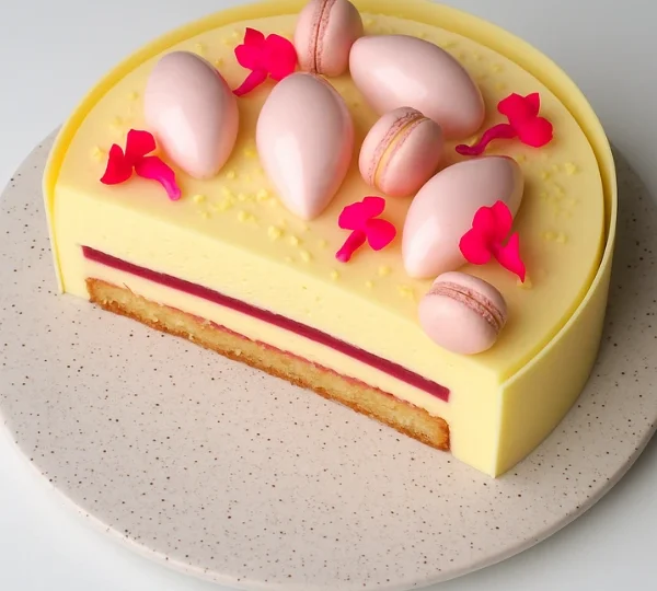 A refreshing elderflower and strawberry mousse cake with biscuit and blondie layers, fruit jelly, and white chocolate glaze. Perfect for spring and summer.This Elderflower & Strawberry Cake is the essence of summer in a dessert—elegant, floral, fruity, and visually stunning. It features a base of strawberry biscuit and blondie, layered with strawberry-elderflower jelly, elderflower mousse, and strawberry mousse domes glazed in white chocolate.Finished with a white chocolate band, fresh flowers, macarons, and glazed quenelle-shaped mousses, this cake is as delightful to look at as it is to eat. It’s perfect for birthdays, garden parties, or any occasion that calls for a light and impressive dessert.