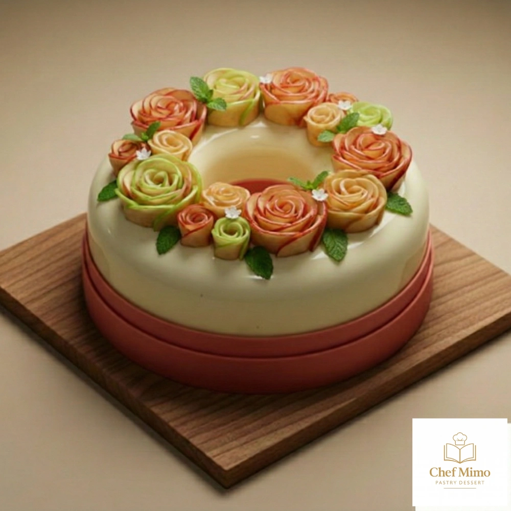 A luxurious French mousse cake layered with cinnamon-spiced cake, gingerbread crumble, vanilla pastry cream, apple compote, pecan praliné, and an airy mousse — finished with a clear mirror glaze and apple rose decoration.
