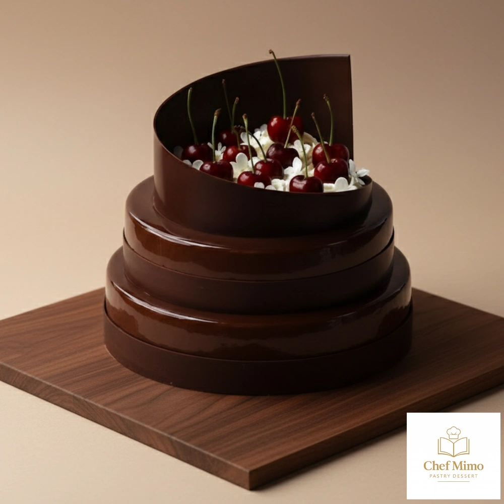 A modern Schwarzwälder Kirschtorte Entremet featuring moist chocolate cake, milk-chocolate crunch, cherry & kirsch ganache, double cherry compote, mascarpone whipped ganache layers, a silky milk-chocolate mousse, and a glossy dark mirror glaze. Finished with domes, chocolate ribbons, and fresh cherries for an elegant Black Forest re-invention.