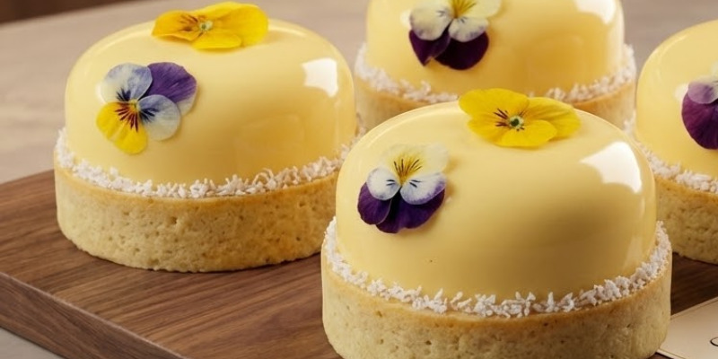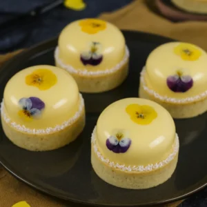 Passion Fruit Tartlets with Edible Viola Flowers – Exotic Mini Cakes with Coconut, Mango & Pistachio