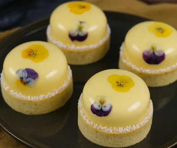 Passion Fruit Tartlets with Edible Viola Flowers – Exotic Mini Cakes with Coconut, Mango & Pistachio
