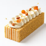 In the pantheon of modern French pastry, Chef Yann Brys (Meilleur Ouvrier de France) is revered for his elegance and technique. The Bûche Frivole ("Frivolous Log") is a prime example of his style: sophisticated, airy, and texturally complex. Unlike traditional rolled logs, this is an Entremet Bûche, built in layers of rectangular precision.The flavor profile is a celebration of the Mediterranean winter. It pairs the warmth of Turrón (Spanish almond nougat) with the bright, floral acidity of Corsican Clementines. Structurally, it relies on the Vanilla Trocadéro Sponge—a biscuit that is far moister and richer than a standard genoise, owing to its high content of almond flour and butter.Why attempt this masterpiece? It is a lesson in balance. The richness of the Turrón Crémeux and the fat of the Trocadéro sponge are cut perfectly by the sharp clementine coulis. It teaches the importance of temperature-controlled emulsions and the precise architecture required to build a multi-layered cake that slices cleanly.